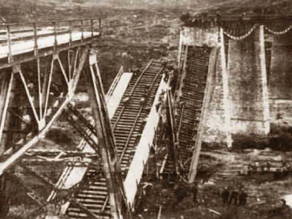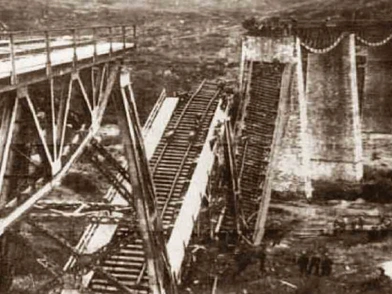 Η πρώτη ανατίναξη έγινε στη 1:30 το ξημέρωμα όπου ανατινάχθηκε ένα μέρος της γέφυρας. Την ώρα εκείνη κατέφθανε μια αμαξοστοιχία με ενισχύσεις από το Λιανοκλάδι.Το τρένο είχε μπει στη γέφυρα όταν έγινε η έκρηξη και συνετρίβη μαζί με ένα τμήμα της.