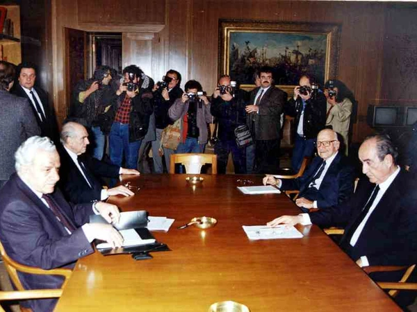 Του σχηματισμού της απίθανης αυτής «οικουμενικής κυβέρνηση» προηγήθηκε μπόλικο παρασκήνιο και αλλεπάλληλες μαραθώνιες συσκέψεις – διαπραγματεύσεις στις οποίες πρωταγωνιστικό ρόλο είχαν οι Γιώργος Σουφλιάς (εκπρόσωπος της ΝΔ), Γιώργος Γεννηματάς (εκπρόσωπος του ΠΑΣΟΚ) και Γιάννης Δραγασάκης ( εκπρόσωπος του Συνασπισμού). Κάπως έτσι φτάσαμε να έχει η Ελλάδα: υπουργό Εθνικής Άμυνας από τη ΝΔ (Τζαννής Τζαννετάκης) υπουργό Εσωτερικών από τον ΣΥΝ (Θεόδωρος Κατριβάνος), υπουργό Εξωτερικών από τη ΝΔ (Αντώνης Σαμαράς), υπουργό Εθνικής Οικονομίας από το ΠΑΣΟΚ (Γιώργος Γεννημάτας) και υπουργό Οικονομικών από τη ΝΔ (Γιώργος Σουφλιάς)!