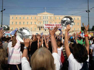 Και στην Ελλάδα υπήρχαν αντιδράσεις αλλά αυτές περιοριζόταν στα στενά όρια των συνδικαλιστικών οργανώσεων, την Αριστερά και τον αναρχικό χώρο. Μια από τις ελάχιστες διαδηλώσεις που πήραν μεγάλες διαστάσεις ήταν αυτή της 5ης Μαΐου του 2010 με την τραγωδία στην τράπεζα της Marfin στην οδό Σταδίου η οποία «πάγωσε» το κίνημα που προσπαθούσε εκείνη την περίοδο να γιγαντωθεί.