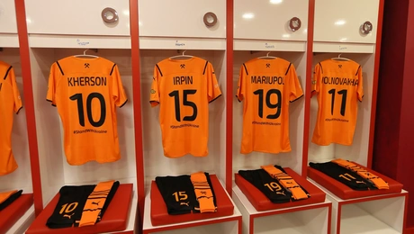 09.04.22 20:19Τα ονόματα πόλεων της Ουκρανίας που βομβαρδίστηκαν στις φανέλες της Σαχτάρ για το φιλικό με τον Ολυμπιακό Στις φανέλες αναγράφονται τα ονόματα πόλεων όπως: Μαριούπολη, Ίρπιν, Μπούτσα, Χοστομέλ, Χάρκοβο,...