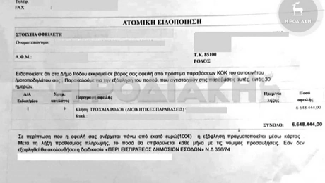 24.07.22 14:52Ρόδος: Της έκοψαν πρόστιμο 6,5 εκατ. ευρώ για τροχονομιακή παράβαση! Για μια παλιότερη τροχονομιακή παράβαση, μια γυναίκα από τη Ρόδο έλαβε ειδοποιητήριο για πρόστιμο...