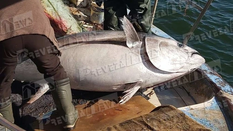 05.03.21 10:35Έπιασαν τόνο... 130 κιλών στην Πρέβεζα – Μαζεύτηκε κόσμος να τον δει! Εντυπωσιάζουν οι εικόνες του τόνου που έπιασε ψαράς στην Πρέβεζα.