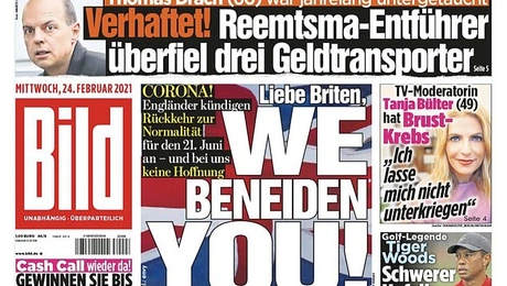 24.02.21 17:40Bild: Αγαπητοί Βρετανοί, σας ζηλεύουμε! Η μεγαλύτερη σε πωλήσεις εφημερίδα της Γερμανίας εξήρε την επιτυχία του εμβολίου της Βρετανίας και...