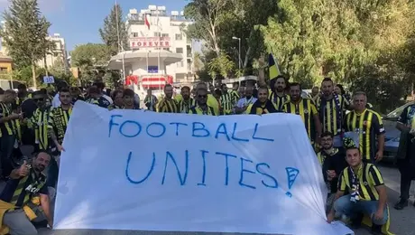 13.10.22 19:17«Το ποδόσφαιρο ενώνει» - Οπαδοί της Φενέρμπαχτσε πήγαν κόντρα στον Ερντογάν και σήκωσαν ειρηνικό πανό στη Λάρνακα Το ειρηνικό μήνυμα που έστειλαν οι οπαδοί του τουρκικού συλλόγου στη Λάρνακα, έρχεται κόντρα στις...