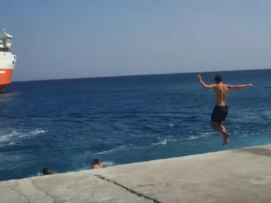 Τι συμβαίνει σε αυτό το βίντεο; Δύο λιμενικοί προσπαθούν αν εμποδίσουν έναν λόχο από εφήβους που πάνε να κάνουν βουτιά στα απόνερα του ferry boat που ξεκινάει την πορεία του για το λιμάνι του Πειραιά.