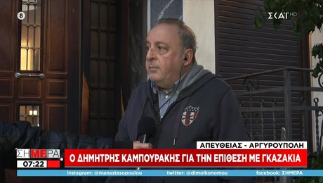 01.02.22 08:04ΕΛΛΑΔΑΔημήτρης Καμπουράκης - επίθεση με γκαζάκια: «Τον έχω σε κάμερα» «Κοιμόμουν και άκουσα ένα μπαμ. Βγήκα έξω είχε πάρει φωτιά η πόρτα όλη. Ενα από τα γκαζάκια δεν...