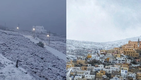 23.01.22 11:44 ΕΛΛΑΔΑΤο απέραντο γαλάζιο των Κυκλάδων έγινε... λευκό: Χιόνια σε Σαντορίνη, Μύκονο, Σύρο, Τήνο, Αμοργό και Νάξο έφερε η «Ελπίς»