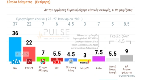 01.03.21 22:36 ΠΟΛΙΤΙΚΗΔημοσκόπηση Pulse: 15 μονάδες μπροστά η ΝΔ από ΣΥΡΙΖΑ - Υπέρ του εμβολίου οι 4 στους 5
