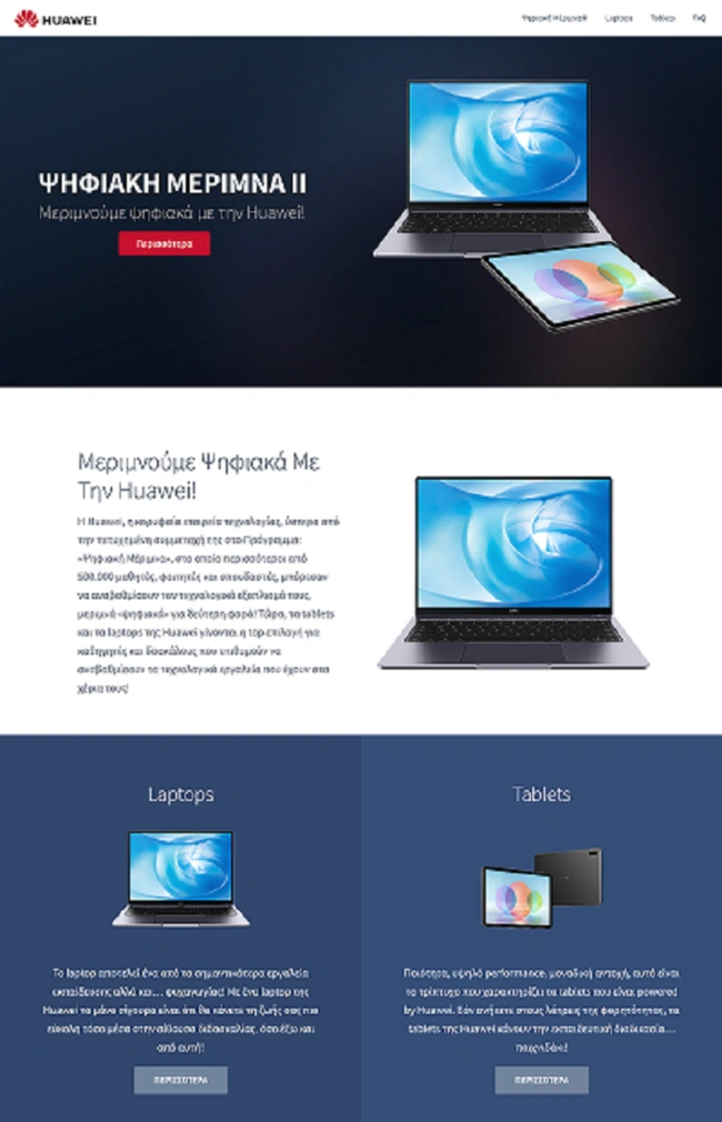 Η HUAWEI συμμετέχει στο πρόγραμμα «Ψηφιακή Μέριμνα ΙΙ», με δεκάδες διαθέσιμα μοντέλα laptop και tablets που κυκλοφορούν στην ελληνική αγορά. Οι δικαιούχοι του Προγράμματος «Ψηφιακή Μέριμνα ΙΙ» μπορούν να τα αποκτήσουν με όφελος 200 ευρώ, σε όλο το δίκτυο συνεργαζόμενων καταστημάτων, έως τις 30 Σεπτεμβρίου 2022.