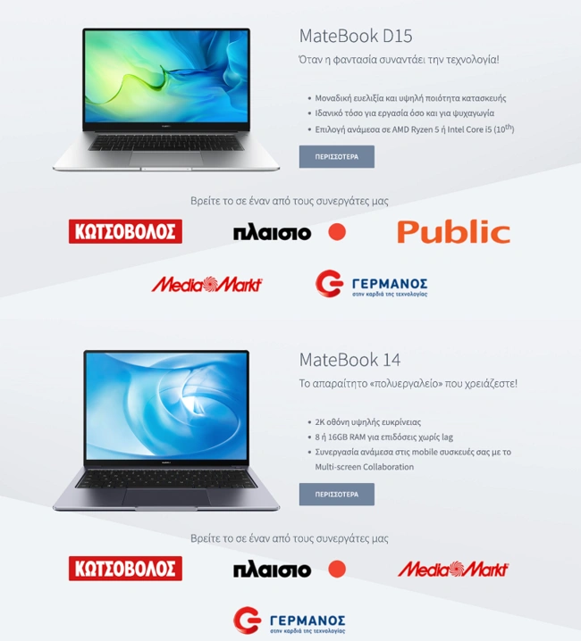 Η Huawei συμμετέχει και στη δεύτερη φάση του προγράμματος, προσφέροντας στους δικαιούχους, τη δυνατότητα να επιλέξουν μέσα από μία πλούσια γκάμα laptop και tablets που διαθέτει στην Ελλάδα, βρίσκοντας αυτό που τους ταιριάζει. Μεγάλη ποικιλία προϊόντων σε laptop, όπως το HUAWEI MateBook D15 ή το HUAWEI MateBook 14, και σε tablet, όπως το MatePad T10 είναι διαθέσιμα για να συμβάλλουν στη βελτίωση της καθημερινότητας των δικαιούχων.