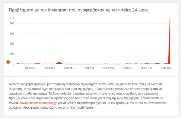 Σημαντικά προβλήματα αντιμετωπίζουν οι χρήστες του Instagram, με αναφορές να κάνουν λόγο πως οι δυσκολίες έχουν κάνει την εμφάνισή τους από το πρωί της Πέμπτης (22/9). Οπως αναφέρει η ιστοσελίδα downdetector, τα συνηθέστερα προβλήματα που αναφέρουν οι χρήστες είναι στην τροφοδοσία περιεχομένου, τη σύνδεση και την ανανέωση του περιεχομένου του προφίλ τους.