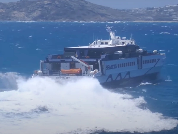 Εντυπωσιάζουν οι εικόνες που δείχνουν το Sifnos Jet να δίνει «μάχη» με τα κύματα ενώ ταξιδεύει στο Αιγαίο με ισχυρούς βόρειους ανέμους εντάσεως 6-7 μποφόρ. Πρόκειται για ένα ακόμα σκάφος που παλεύει με τα κύματα αυτή την περίοδο.