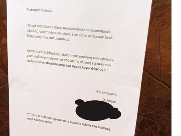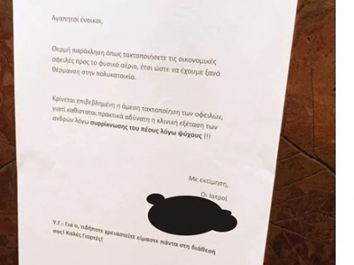 Viral έχει γίνει μία ανακοίνωση που έχει θυροκολληθεί σε πολυκατοικία στο Παλαιό Φάληρο για τη θέρμανση. Η συγκεκριμένη είναι γραμμένη από δύο γιατρούς που λόγω του χρέους που υπάρχει για το φυσικό αέριο, δεν έχουν θέρμανση στο ιατρείο τους, με αποτέλεσμα ο ένας που ασχολείται με την ουρολογία των ανδρών, να μην μπορεί να τους εξετάσει λόγω συρρίκνωσης του πέους των πελατών του.