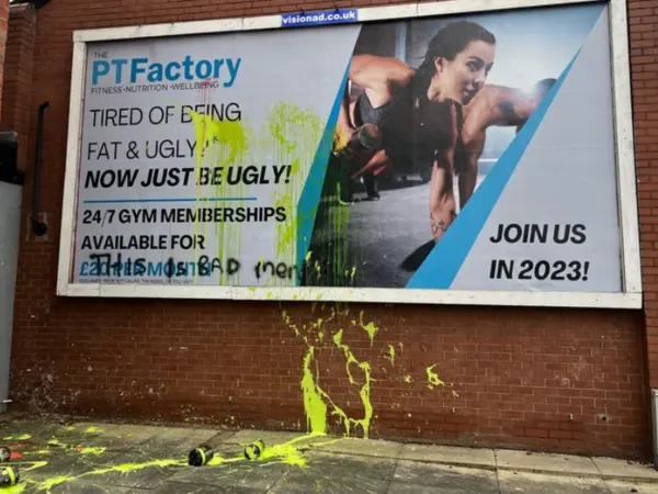 Οργισμένες αντιδράσεις προκάλεσε η διαφήμιση ενός γυμναστηρίου στην περιοχή του Μάντσεστερ της Βρετανίας, καθώς προσπάθησε να... «αστειευτεί» γράφοντας σε αφίσα «κουραστήκατε να είστε χοντροί και άσχημοι; Tώρα μείνετε απλά άσχημοι». Το... επιθετικό marketing δεν βγήκε σε καλό στον ιδιοκτήτη, Όλι Λόρενς, καθώς άτομα πέταξαν μπογιές, ενώ «τα άκουσε» και από αρκετό κόσμο.