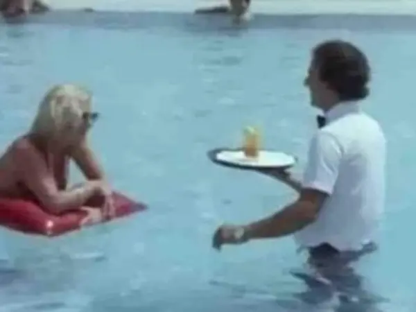 Στη σκηνή που έγινε viral λόγω της ομοιότητας με ό,τι συνέβη στη Ρόδο, φαίνεται ο Νίκος Παπαναστασίου, ο οποίος δουλεύει ως σερβιτόρος, να μπαίνει σε πισίνα προκειμένου να εξυπηρετήσει μια πελάτισσα.