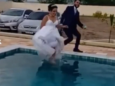 «Αυτό ήταν η αρχή του τέλους», «έρχεται διαζύγιο» ήταν μερικά από τα σχόλια, με τη νύφη να κρατάει το χαμόγελό της και να προσπαθεί να βγει από την πισίνα.