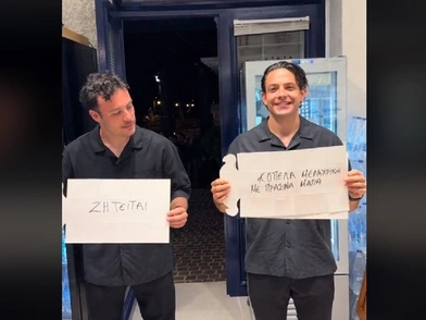 Αμέσως ο ένας καταλαβαίνει τη «γκάφα» και σκουντάει τον δίπλα, που αμέσως αλλάζει τα προαπαιτούμενα σε «Ζητείται προσωπικό».