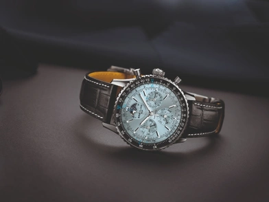 Το νεότερο αυτό μοντέλο Navitimer διαθέτει καντράν στο μπλε του πάγου, που συμπληρώνεται από μια πλατινένια στεφάνη σε κάσα 43 mm από ανοξείδωτο ατσάλι και ολοκληρώνεται με την εικονογραφημένη φάση Σελήνης στις 12 το μεσημέρι.