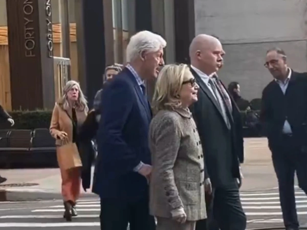 Στην πολυσύχναστη διασταύρωση της Νέας Υόρκης ο Μπιλ Κλίντον διακρίνεται να σπρώχνει ελαφρώς τη Χίλαρι με αποτέλεσμα εκείνη να τραβηχτεί πίσω και να διαμαρτυρηθεί.