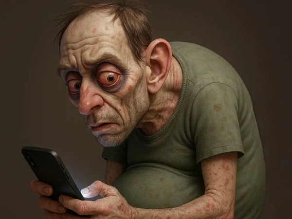 Τα μάτια του είναι ξηρά και ερεθισμένα, γεγονός που συμβαίνει από την υπερβολική έκθεση στο μπλε φως, το οποίο μπορεί να προκαλέσει ξηροφθαλμία, πονοκεφάλους, θολή όραση και πρόωρη γήρανση του δέρματος.