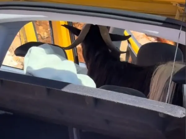 Όπως φαίνεται στο βίντεο που κάνει τον γύρο του διαδικτύου, ο τράγος, όχι απλά τρίπωσε στην πίσω θέση του αυτοκινήτου των τουριστών, αλλά δεν έβγαινε κιόλας.