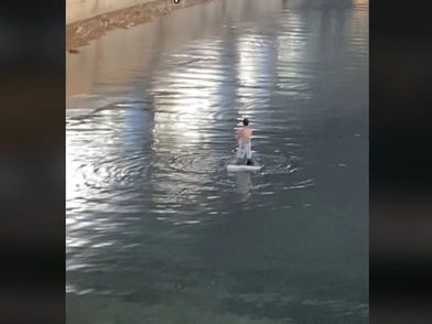Ο άνδρας με μία αυτοσχέδια σανίδα και ένα κουπί κάνει αμέριμνος ράφτινγκ, ενώ το βίντεο συγκεντρώνει δεκάδες χιλιάδες views και εκατοντάδες σχόλια. Πολλοί σχολιάζουν το κατά πόσο είναι καθαρά τα νερά, ενώ το χιούμορ αφθονεί.