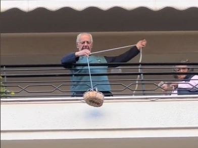 Ένας κύριος που φαίνεται ότι είναι λάτρης του φρέντο καπουτσίνο, βρήκε μια πατέντα για να παίρνει τον καφέ από απέναντι. Συγκεκριμένα, απεικονίζεται στο βίντεο να σηκώνει αργά ένα σχοινί, στο οποίο ήταν δεμένο ένα καλάθι μέσα το οποίο βρίσκονταν δύο φρέντο καπουτσίνο. Και κατάφερε να πάρει τους καφέδες στον έκτο όροφο.