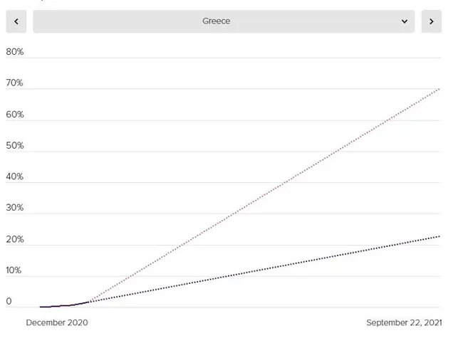 Σύμφωνα με την εκτίμηση του Politico, αυτό θα συμβεί τον Μάρτιο του 2023, γεγονός που κατατάσσει την Ελλάδα στην 7η θέση της λίστας στην Ευρώπη. Στην κορυφή βρίσκεται η Μεγάλη Βρετανία, η μόνη χώρα που αναμένεται όχι μόνο να έχει πετύχει εμβολιαστική κάλυψη του 70% του πληθυσμού της τον Αύγουστο του 2021, αλλά να έχει υπερβεί αρκετά (94%) τον στόχο.