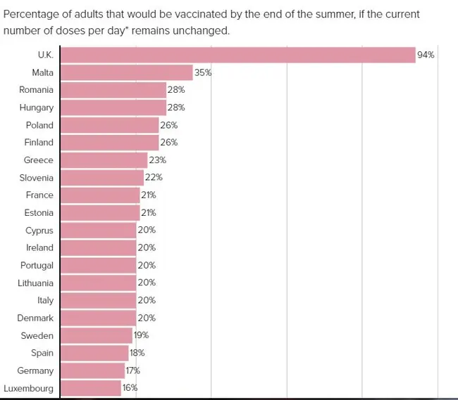 Όπως σημειώνει η δημοσίευση, κανένα κράτος-μέλος της Ε.Ε. δεν θα πετύχει τον κοινό στόχο για τους εμβολιασμούς, εάν δεν βρεθεί λύση με την AstraZeneca. Οι σημερινοί ρυθμοί εμβολιασμού κυμαίνονται αρκετά χαμηλά με βάση τις αρχικές προσδοκίες και φτάνουν μετά βίας το 30% της κάλυψης του ενήλικου πληθυσμού έως το τέλος του καλοκαιριού. Ορισμένες χώρες θα είναι ακόμα και κάτω από το 20%.