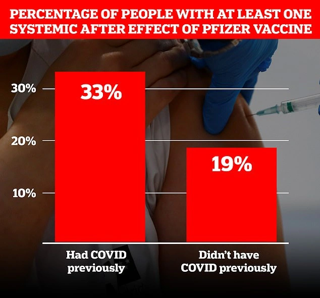 Τα στοιχεία από μια εφαρμογή παρακολούθησης συμπτωμάτων δείχνουν ότι το 33% των ανθρώπων που είχαν ήδη νοσήσει, υπέμειναν τουλάχιστον μία ήπια παρενέργεια, όπως κόπωση ή πονοκέφαλος μία εβδομάδα μετά τη λήψη του εμβολίου.