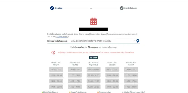 - Επιλέγουμε εμβολιαστικό κέντρο καθώς και τη διαθέσιμη ημερομηνία