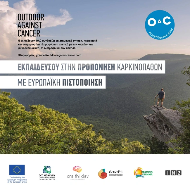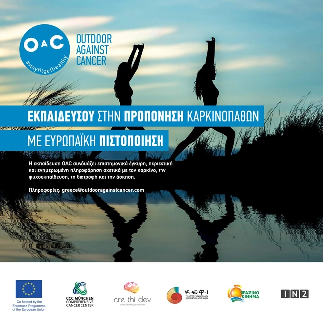 Σε αυτή τη σημαντική παράμετρο, εστιάζει το «Outdoor Against Cancer» (OAC) το οποίο υλοποιείται και στη χώρα μας, σε συνεργασία με το πρόγραμμα Erasmus της Ευρωπαϊκής Ένωσης. Στόχος του OAC είναι να εκπαιδεύσει επαγγελματίες άσκησης, ευεξίας και υγείας και να τους εφοδιάσει με όλες τις απαραίτητες γνώσεις για να προπονούν και να συνεργάζονται με τον καταλληλότερο τρόπο με καρκινοπαθείς, λαμβάνοντας υπόψη τις ατομικές ανάγκες του ασθενούς κατά την άσκηση και την (απο)θεραπεία.