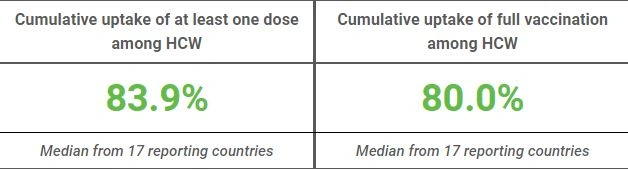 Μεταξύ των 17 χωρών που παρέχουν τα σχετικά στοιχεία στο ECDC, με ποσοστό 83,9% των υγειονομικών να έχουν λάβει τουλάχιστον μία δόση (80% για τους πλήρους εμβολιασμένους), η Ελλάδα βρίσκεται στο ίδιο επίπεδο με τη Σουηδία και προηγείται της Εσθονίας (83,2%), του Λουξεμβούργου (82,5%), του Βελγίου (80,4%), της Σλοβενίας (71,5%), της Λετονίας (69%), της Δανίας (68,7%), της Κροατίας (68,5%) και της Βουλγαρίας, η οποία εμφανίζει μακράν το χαμηλότερο ποσοστό (23,5%).