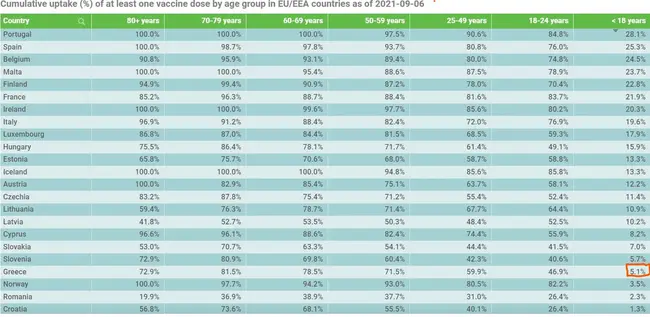 Με ποσοστό 5,1%, η Ελλάδα βρίσκεται στην 20η θέση μεταξύ 24 κρατών της ΕΕ/ΕΟΧ, αναφορικά με τη χορήγηση τουλάχιστον μίας δόσης του εμβολίου στις ηλικίες κάτω των 18 ετών (έως 9/6/2021).