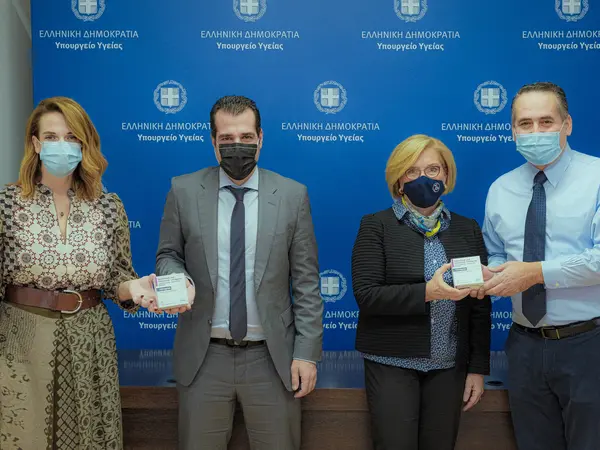 Ο υπουργός Υγείας Θάνος Πλεύρης και η αναπληρώτρια υπουργός Υγείας Μίνα Γκάγκα συναντήθηκαν σήμερα με εκπροσώπους της φαρμακευτικής εταιρείας Roche για την επίσημη παραλαβή των πρώτων παρτίδων του φαρμάκου των εταιρειών Regeneron-Roche κατά της Covid-19, βασισμένο σε μονοκλωνικά αντισώματα.