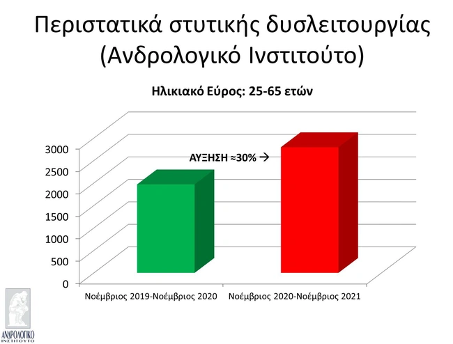 «Τον τελευταίο χρόνο παρατηρήθηκε μια αύξηση των περιστατικών με στυτική δυσλειτουργία (ΣΔ) στο Ανδρολογικό Ινστιτούτο της τάξης του 30%. Η αύξηση αυτή ήταν αρχικά ανεξήγητη με βάση τα προηγούμενα δεδομένα και την εμπειρία μας, έτσι αποφασίσαμε να ελέγξουμε τη συννοσηρότητα των ανδρών που αναζήτησαν βοήθεια για ουρολογικά προβλήματα», τονίζει ο κ. Χρήστος Φλιάτουρας, Επιστημονικός Διευθυντής του Ανδρολογικού Ινστιτούτου.