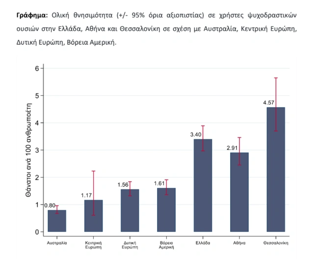 Ιδιαίτερα ανησυχητικά είναι τα δεδομένα ερευνών του πανεπιστημίου Αθηνών για τους θανάτους στη χώρα μας από ναρκωτικά. Ειδικότερα, την περίοδο 2018-2021, καταγράφηκαν 213 θάνατοι σε σύνολο 2.406 χρηστών, που ήταν σε παρακολούθηση. Μάλιστα, η θνησιμότητα αυτή στην Ελλάδα είναι η μεγαλύτερη, που έχει παρατηρηθεί στη Δυτική και Κεντρική Ευρώπη, στη Βόρεια Αμερική και την Αυστραλία από συγκεντρωτικά δεδομένα 84 μελετών! Τα σοκαριστικά δεδομένα των μελετών ανακοινώθηκαν από τους καθηγητές Άγγελο Χατζάκη και Βάνα Σύψα σε συνέντευξη Τύπου, που διοργάνωσαν το Δίκτυο Ομότιμων Χρηστών Ψυχοδραστικών Ουσιών, ο Σύλλογος Ασθενών Ήπατος Ελλάδος «Προμηθέας» και ο Σύλλογος Οροθετικών Ελλάδος «Θετική Φωνή», σε συνεργασία με τις οργανώσεις της Πλατφόρμας Μείωσης της Βλάβης (PRAKSIS, Steps και Γιατροί του Κόσμου) και τον Δήμο Αθηναίων.