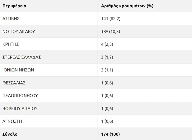 Για τους 164 μόνιμα διαμένοντες στην Ελλάδα υπήρχε διαθέσιμη πληροφορία για ταξίδι στο εσωτερικό εντός της περιόδου επώασης για 160 (98%). Από αυτούς οι 117 ανέφεραν ταξίδι στο εσωτερικό της χώρας εντός του χρόνου επώασης. Ενενήντα τέσσερα κρούσματα (80,3%) είχαν ταξιδέψει στις Κυκλάδες, 9 (7,7%) στο Νότιο Αιγαίο, 8 (6,8%) στο Ιόνιο, 3 (2,6%) στο Βόρειο Αιγαίο και 3 (2,6%) σε προορισμούς της Ηπειρωτικής Ελλάδας. Υπενθυμίζεται ότι για την πρόληψη της διασποράς του ιού στην κοινότητα πρέπει να τηρούνται σχολαστικά τα μέτρα ατομικής υγιεινής και τα μέτρα ατομικής προστασίας, ενώ ο εμβολιασμός παραμένει το πιο αποτελεσματικό μέτρο πρόληψης για τον πληθυσμό.